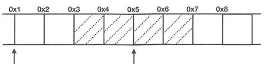 假设现在有一个4字节整数类型数据,首地址并不是4的倍数,假定位0x3,则该类型存储在地址为0x3~0x7的内存空间中。因此CPU如果像读取该数据,则需要分别在0x1和0x5处进行两次读取,而且还需要对读取到的数据进行处理才能得到该整数,如图: