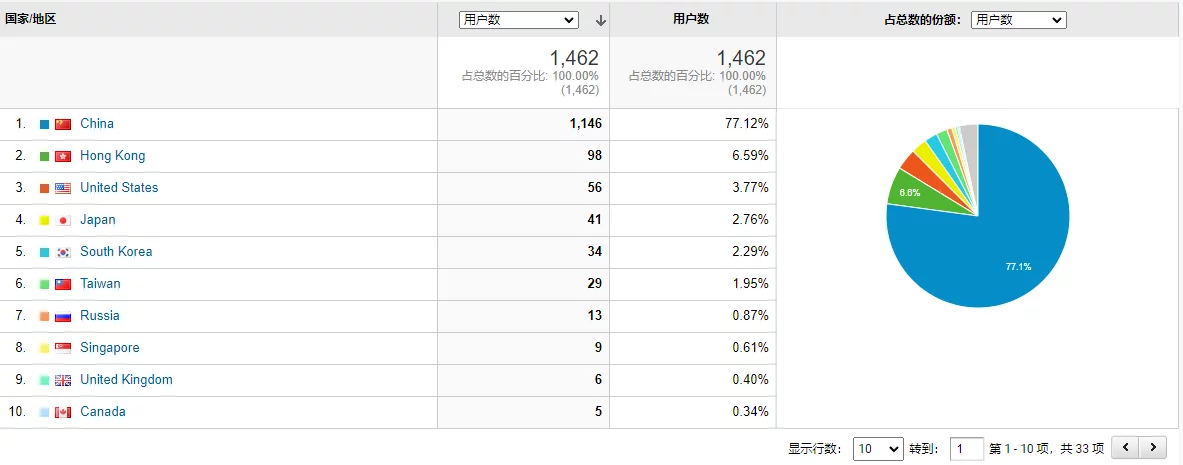 站点访客的地理分布,中国大陆占主力,其次是美、日、韩: