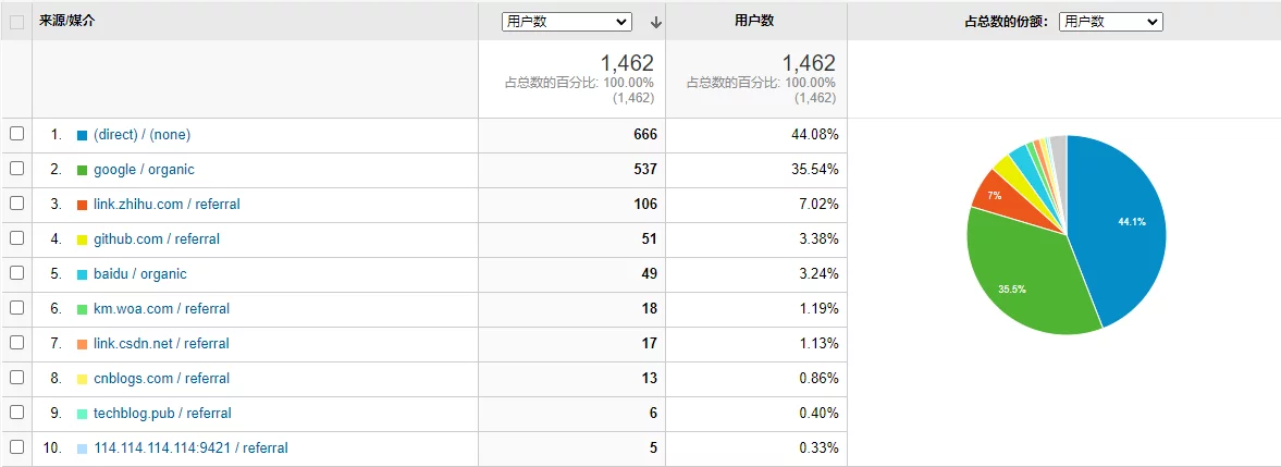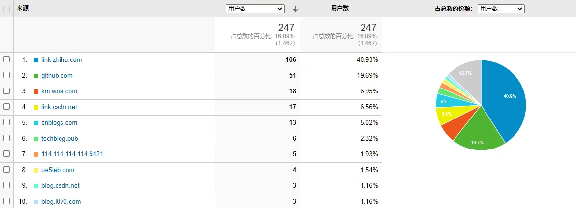 知乎的主要流量来源是虚幻中国的周报,github则是我的开源项目中的链接,占总体流量的不到10%,但在引荐流量中占比达到60%.