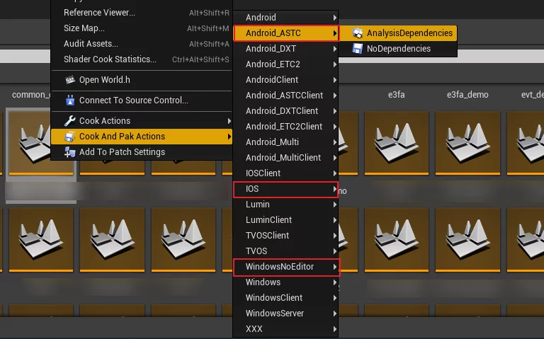 在我们当前的工程中,在编辑器中,可以直接在资源、目录上右键选择Cook And Pak Actions,选择对应的平台,以及选择AnalysisDependencies(分析依赖)。