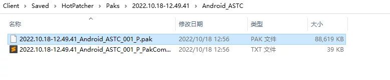 执行完毕之后,会在项目的Saved/HotPatcher/Paks/{EXECUTE_TIME}/Android_ASTC下面创建出一个对应的 .pak 文件,这个 pak 文件就是打包资源的补丁包,文件名中包含了平台名,不同平台的 pak 文件不能混用。