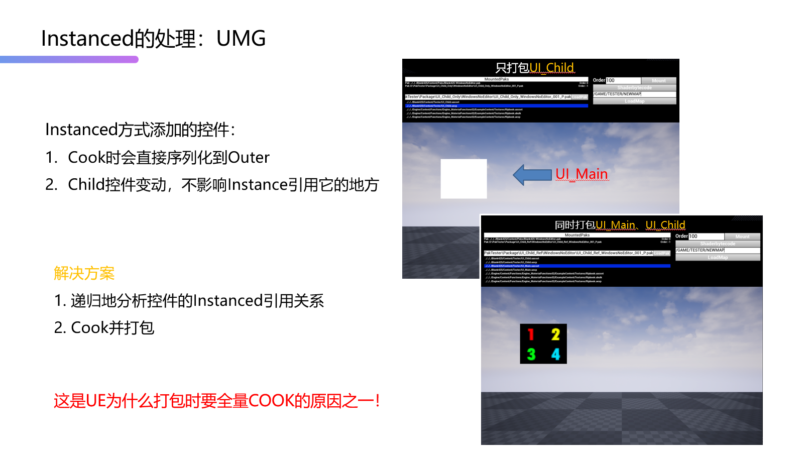 如果Instanced的形式引用的UMG,子UMG的变动需要递归包含所有以子控件形式引用的UMG资源。我之前在笔记中记录过这个问题:UE4#UMG的子控件引用热更问题。