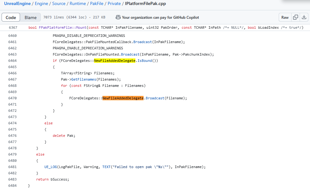 具体来说,就是在引擎的FPakPlatformFile::Mount挂载成功之后,是否会调用FCoreDelegates::NewFileAddedDelegate.Broadcast(Filename):