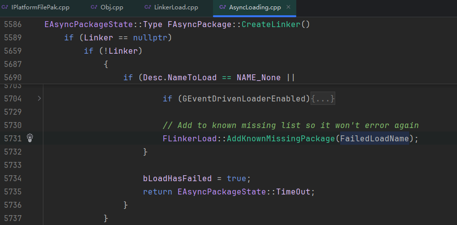 而OnNewFileAdded内的逻辑就是反过来,如果有新的PAK被Mount进来,就代表可能存在有新的资源。就把PAK中的文件列表转成资源路径,检查是否是标记为MissingPackage,是的话就移除。因为这个资源在新的PAK中,也已经被挂载进来了,实际上是可以找到它的。