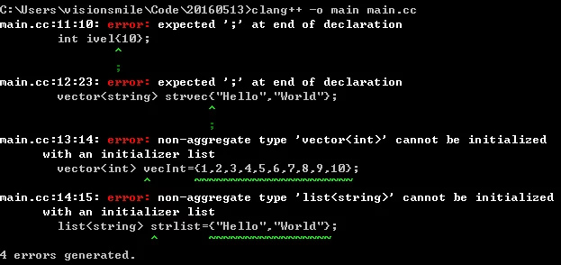 以上代码编译时如果不加std=c++11会产生四个错误: