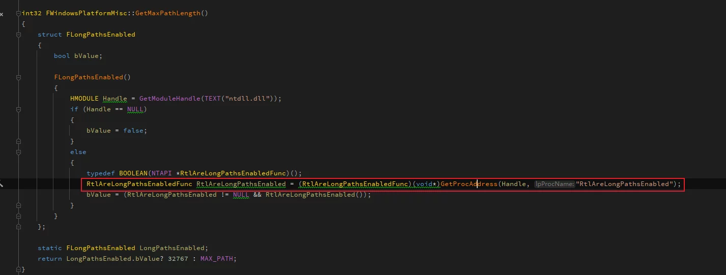 显然UE并没有使用Windows提供的MAX_PATH宏,硬编码为了260,即在UE中Windows上的文件路径最大长度为260个字符(在启用bConsiderCompressedPackageFileLengthRequirements时还要减去32个字符),虽然Windows10要[移除260字符的限制](Microsoft removes 260 character limit for NTFS Path in new Windows 10 Insider Preview),引擎里已经支持,(UE4.22 Released支持了长文件名的特性(实验性))。
