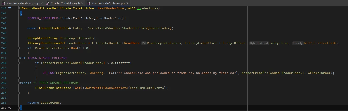 FShaderCodeArchive中有函数ReadShaderCode,可以指定加载某一个ShaderCode: