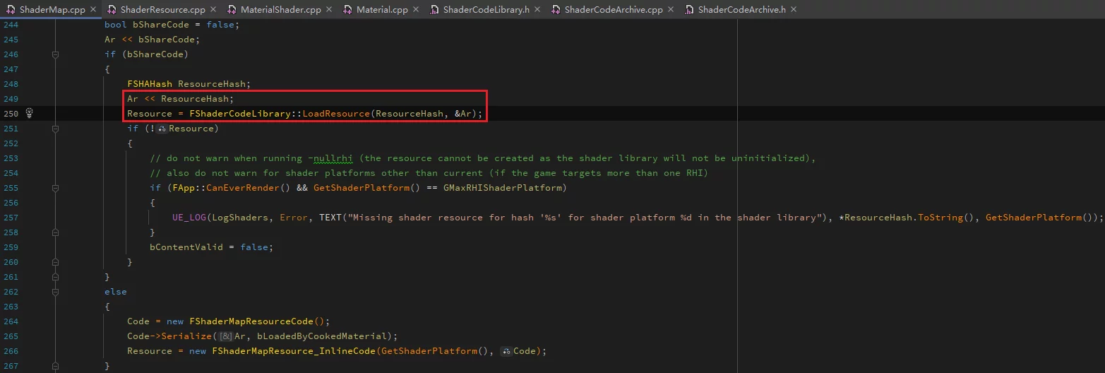 在读取时通过这个FSHAHash值,通过FShaderCodeLibrary::LoadResource加载: