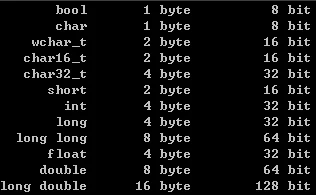 | 1 | printf("%11s\t%3d byte\t%3d bit\n","bool",sizeof(bool),sizeof(bool)*8); |