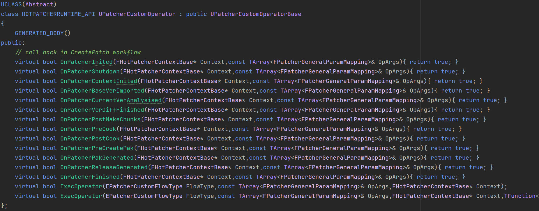 | UCLASS(Abstract) class HOTPATCHERRUNTIME_API UPatcherCustomDiffGenerator : public UPatcherCustomOperatorBase { GENERATED_BODY() public: virtual bool DiffVersionByContext(FHotPatcherContextBase* Context){ return false; } };