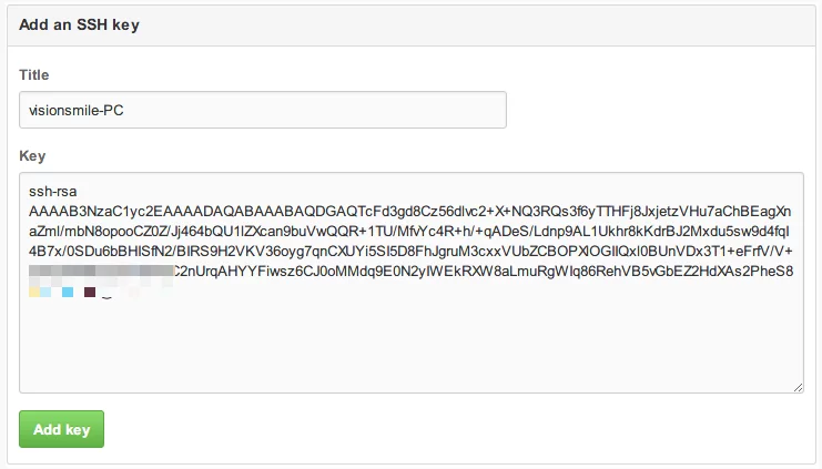 1、打开本地C:\Users\visionsmile\.ssh\id_rsa.pub文件。此文件里面内容为刚才生成人密钥。如果看不到这个文件,你需要设置显示隐藏文件。准确的复制这个文件的内容,才能保证设置的成功。