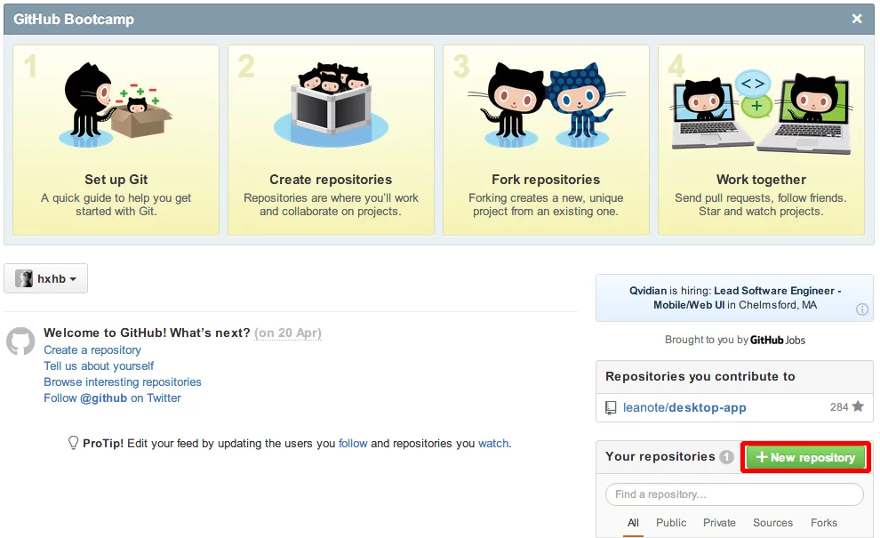 登录后系统,在github首页,点击页面右下角「New Repository」