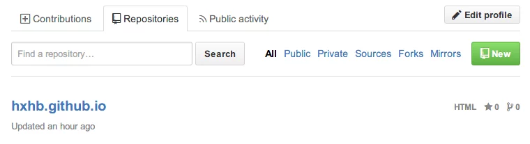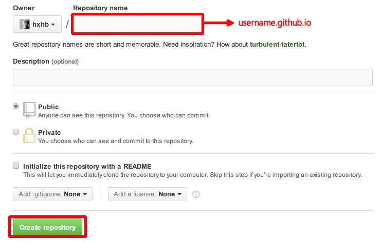 注:Github Pages的Repository名字是特定的,比如我Github账号是hxhb,那么我Github Pages Repository名字就是hxhb.github.io。