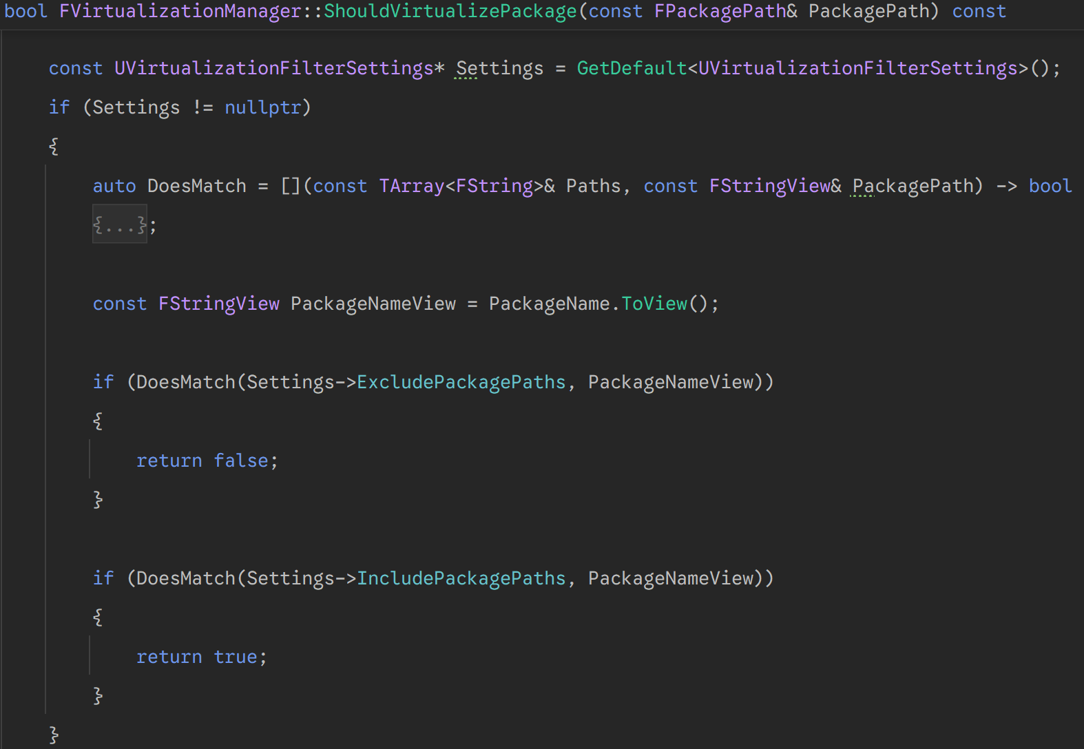 这两项配置会在FVirtualizationManager::ShouldVirtualizePackage中使用: