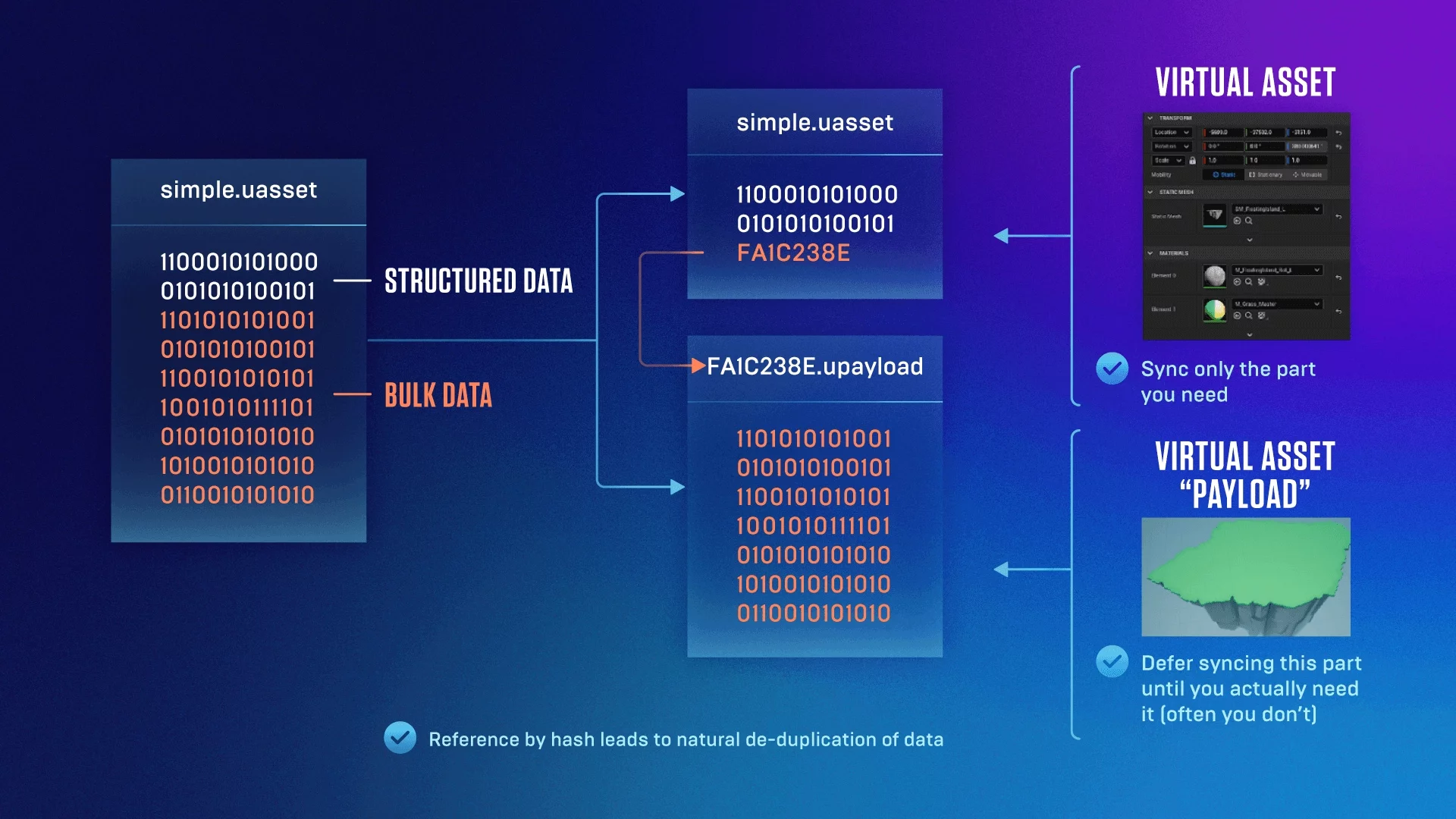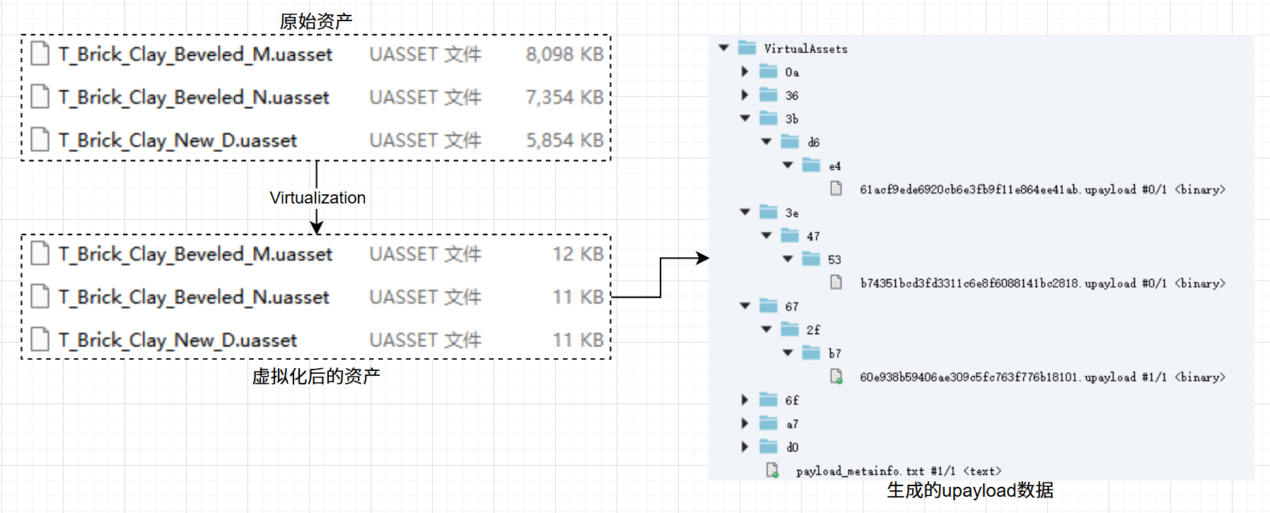 Virtual Assets是一项资产元信息与数据剥离的方案,可以把传统UE项目中的uasset拆分为uasset+payload的形式,对于无需加载的资产而言,只需要虚拟化后的uasset,它不包含实际的资产BulkData,当实际访问到该资产时,再从Server上把资产的Payload数据拉取下来,从而实现减少拉取的工程规模的目的。