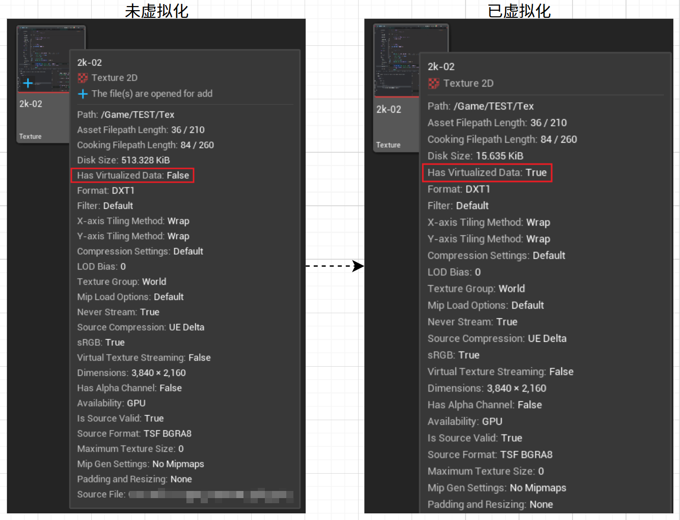 在引擎中可以查看Has Virtualized Data来资产是否进行过虚拟化: