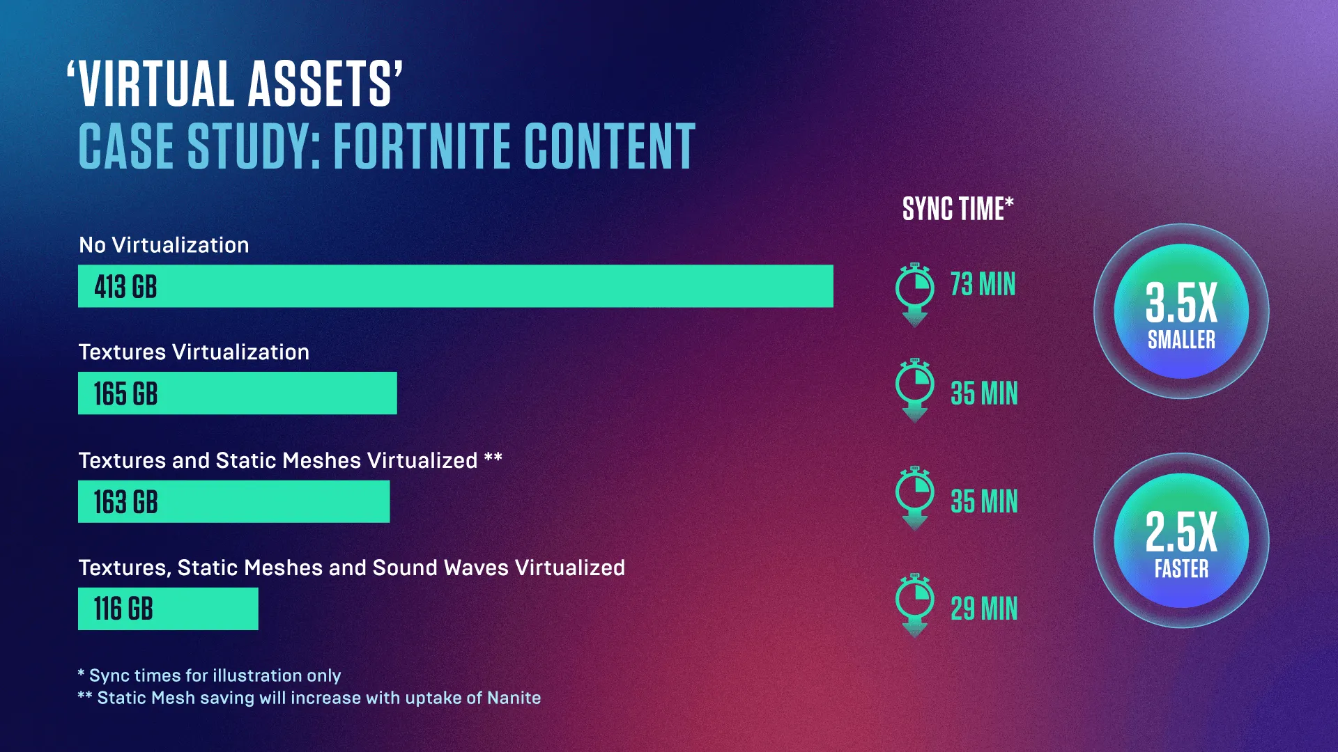 在Epic自己的数据中,虚拟化的数据也非常好(Texture是大头,仅贴图虚拟化后就可以减少总体60%的大小):