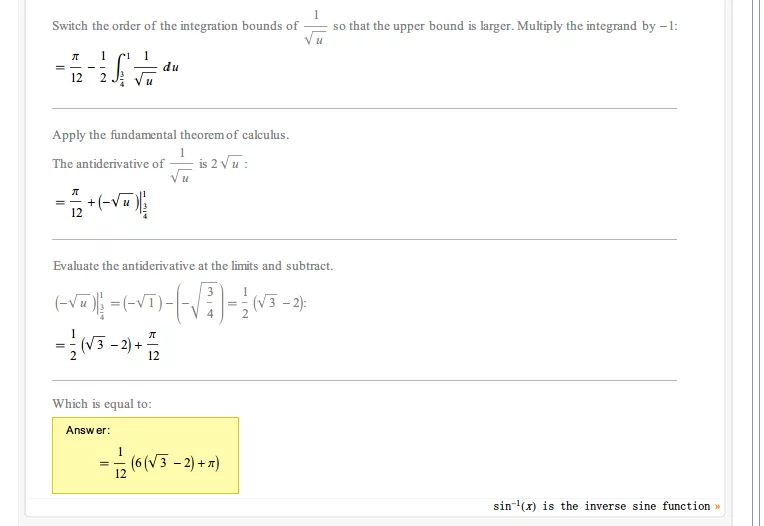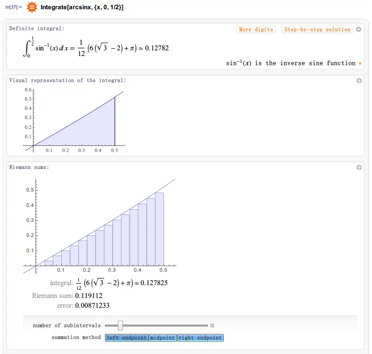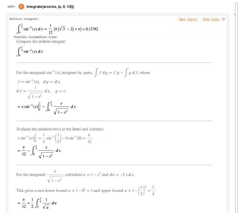 使用WolframAlpha尝试计算下列积分:$\int_{0}^{1/2}arcsinx{\mathrm{d} x}$