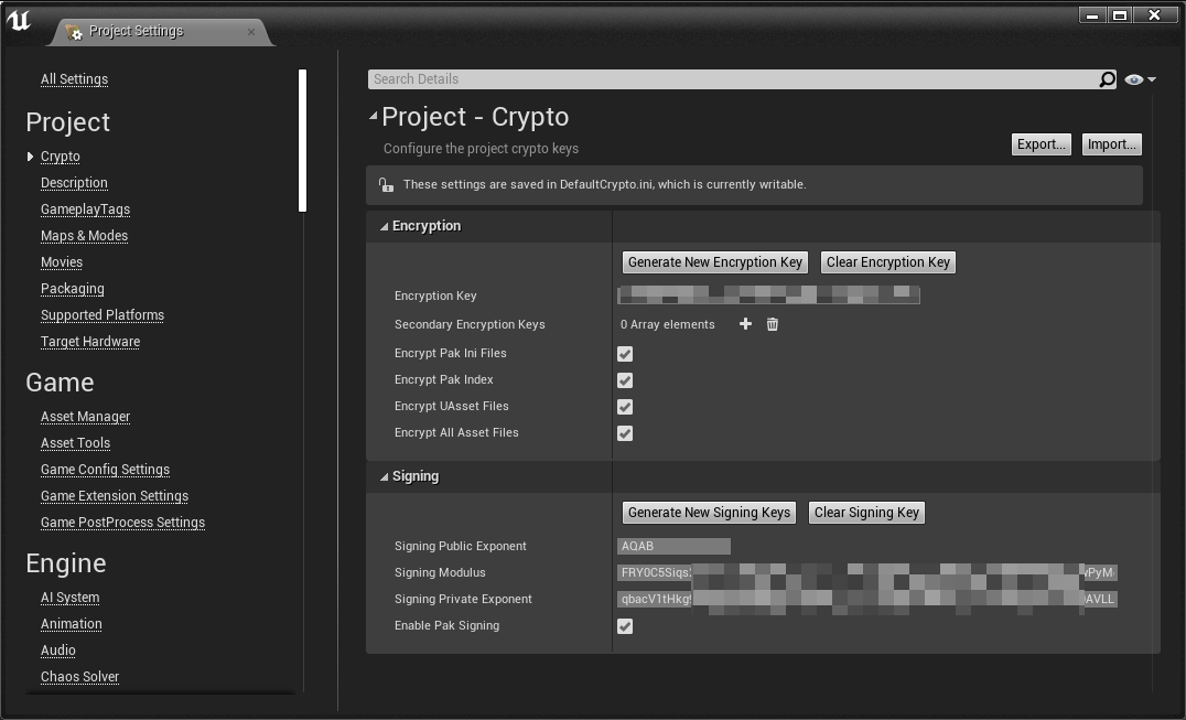 这些配置会被用在UnrealPak打包资源时,以及在编译代码时,把解密的Key编译到可执行程序之内。