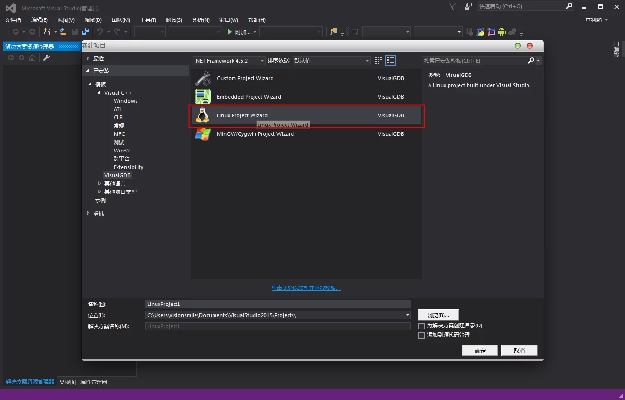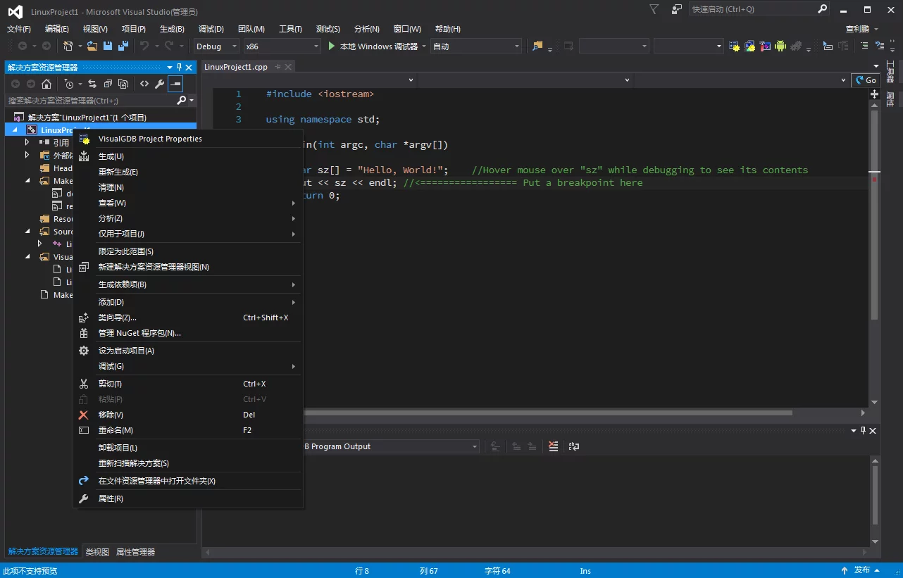 下面是多图来介绍在VS使用VisualGDB来创建并运行一个Linux项目: