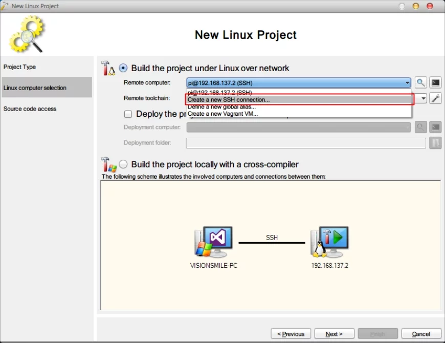 当我们选择Linux Project Wizard时,我们还需要一台可以SSH连接上的设备(虚拟机/VPS/树莓派等),因为我们创建的项目实际上是要在Linux的环境上执行的,不过我们可以在VisualStudio中调试/运行来控制在Linux跑的项目。