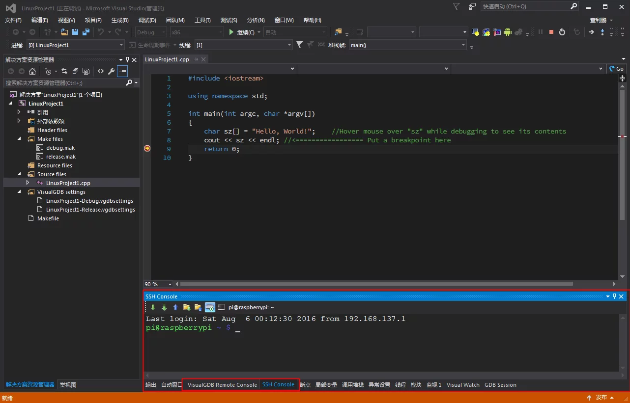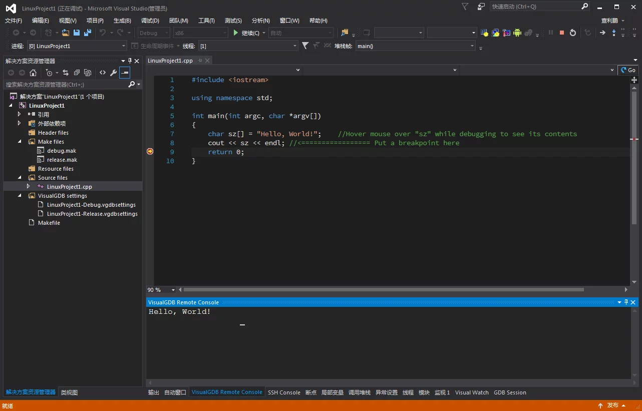 可以直接在VS中对Linux项目打断点并查看局部变量等各种信息: