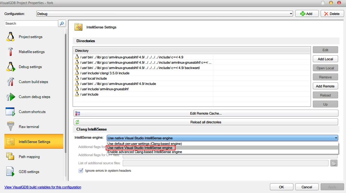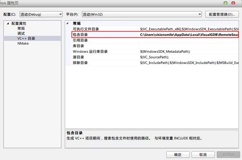 将其中的包含目录中添加一个路径,为C:\Users\username\AppData\Local\VisualGDB\RemoteSourceCache\yourVPShost\0000\include,其中的username/yourVPShost根据你自己的情况修改,比如我需要包含的路径就是: